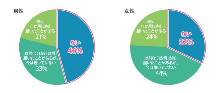 男女ともに「なんとなく履く機会がなくなった(なかった)」がトップでしたが、「見た目が好みでない」という回答が2位に上がっていました。その割合は、男性は女性の約1.4倍となり、男性の場合は「5本指靴下を履いているとかっこ悪い」という意識が高いようです。