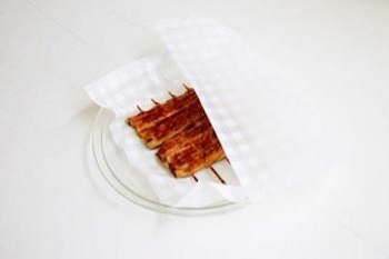 冷凍した肉や魚を解凍するときは、ラップを外してクッキングペーパーで包んで解凍します。電子レンジは、食品の水分子を振動させその摩擦熱で加熱するので、解凍時に出た余分なドリップを吸いとることで、溶け出したドリップの加熱による加熱ムラがなくなります。