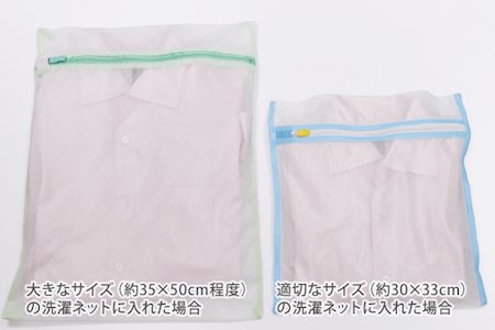 重要なのが、「衣類のサイズに合った洗濯ネット」を使用すること。衣類より大きい洗濯ネットを使用すると、下の写真のように洗濯ネットの中で衣類がかたより、逆にしわができてしまうことがあります。
