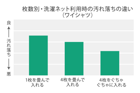 洗濯ネットに1枚たたんで入れた時と、複数枚入れた時の汚れの違いを比べてみると、洗濯ネット1枚にワイシャツを多く入れる程、洗浄力が低下することがわかりました。