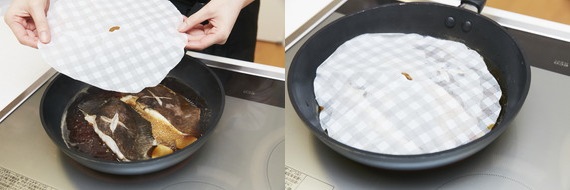 クッキングシートを鍋の大きさに切り、中央に切り込みを入れて落し蓋をすると、短時間で味がしっかり染み込むので、長く煮る必要もありません。