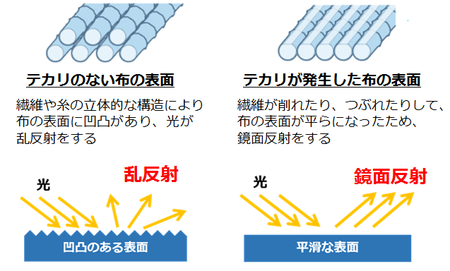テカリとは、着用の繰り返しにより衣類に生じる局部的な光沢のこと。制服やスーツの多くは、素材にウールなどの毛製品が採用されていて、繊維や糸の立体的な構造により布の表面に凹凸があります。椅子に座ったりして部分的に加重がかかると、摩擦や圧力で繊維の表面が削れたりつぶれたりして平らになり、光が鏡面反射してテカリが発生します。